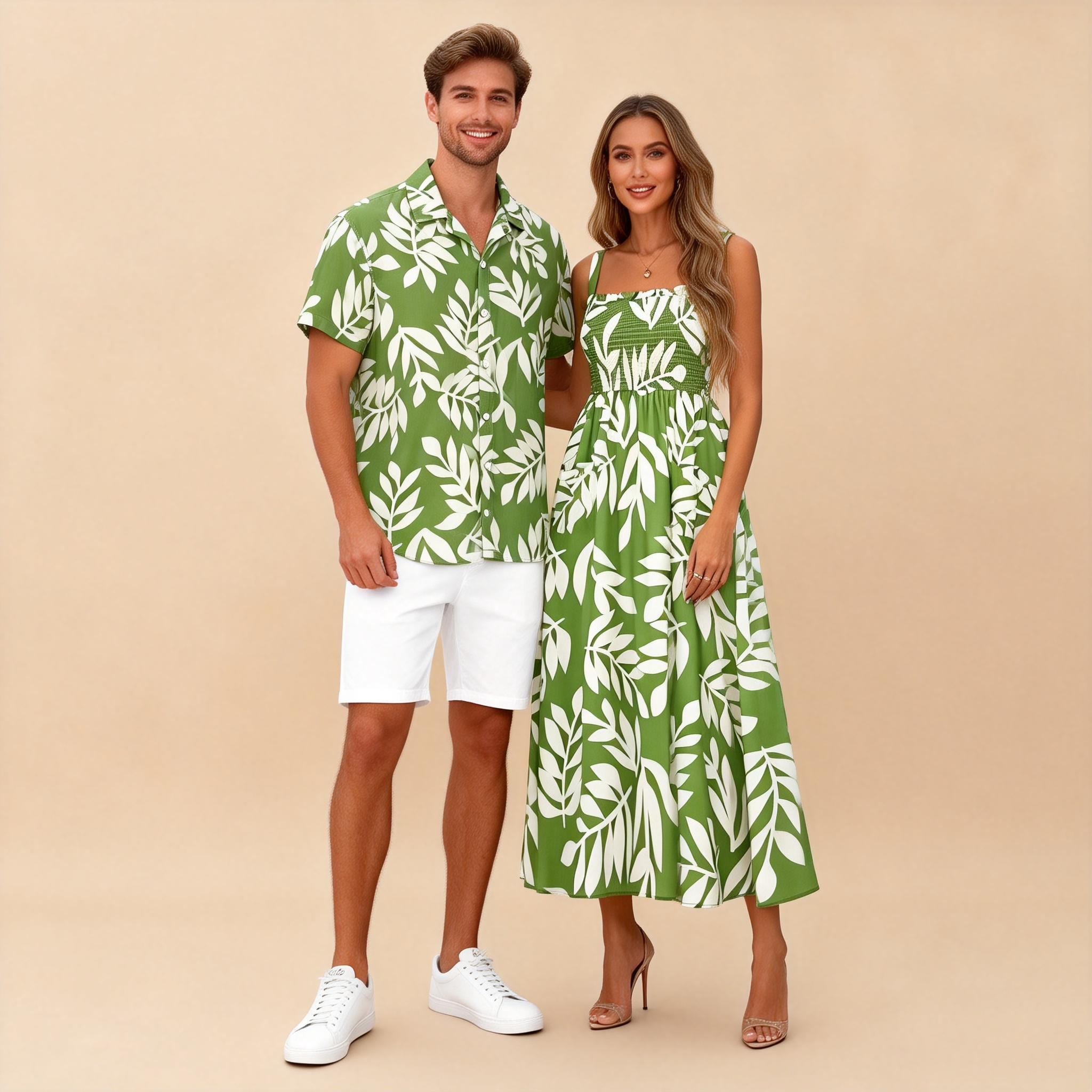 Matching Couples Vacation Looks – Printed Button-Up & Bohemian Dress