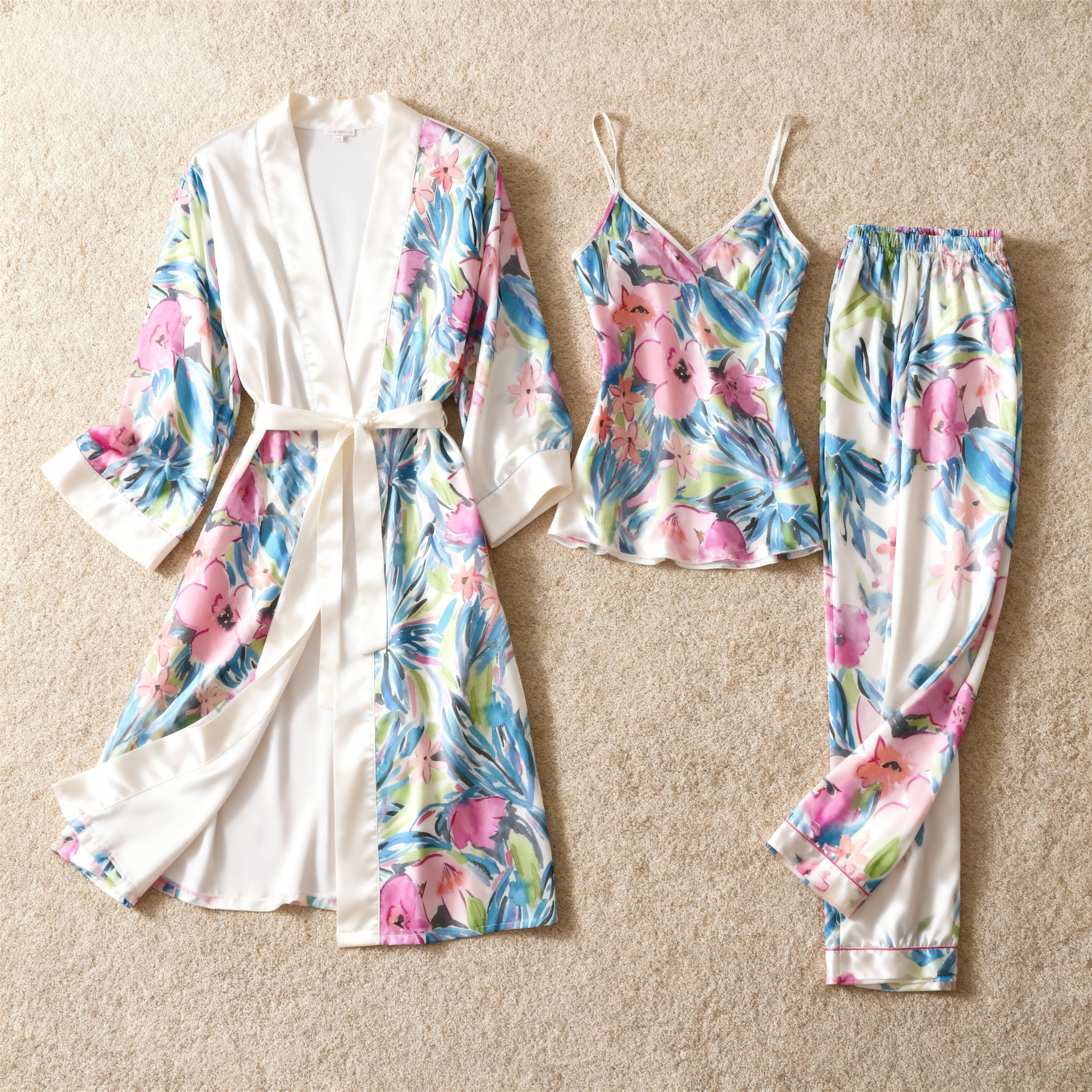 3-Piece Satin Sleepwear Set for Women – Flower Design