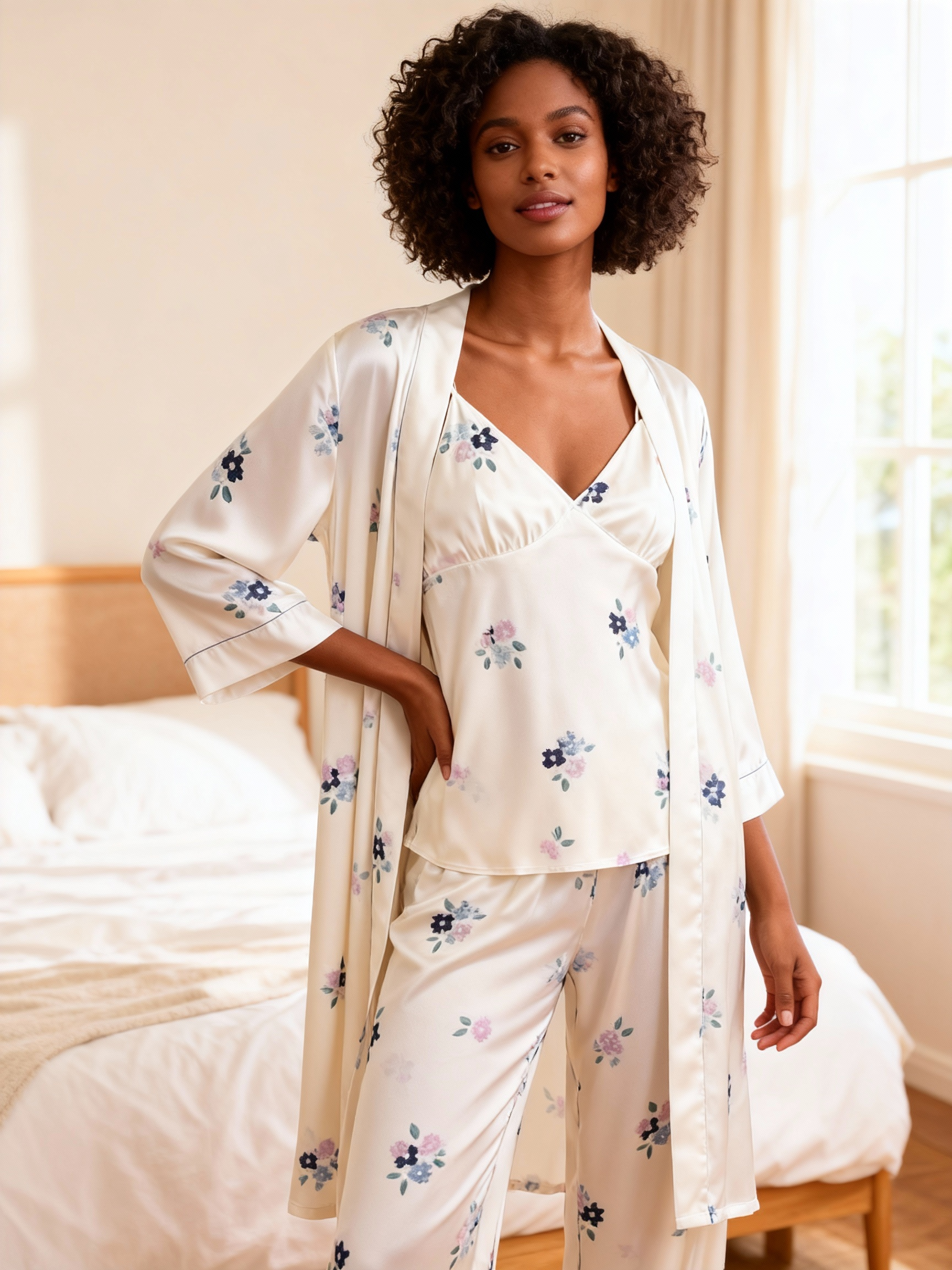 Chic 3-Piece Satin Nightwear Set Featuring Simple Floral Motifs