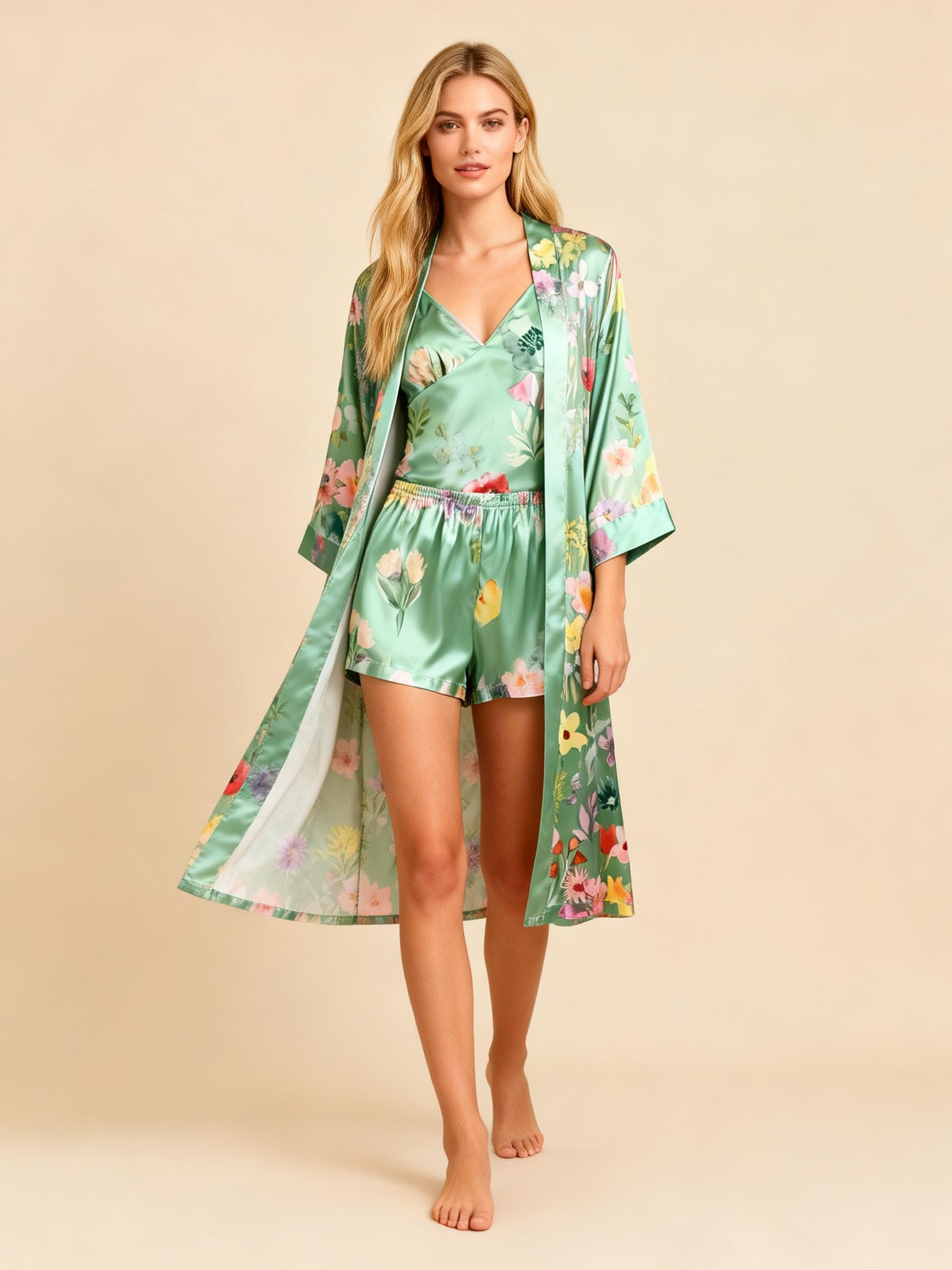 Chic Green Satin 3-Piece Pajama Set Featuring Floral Designs