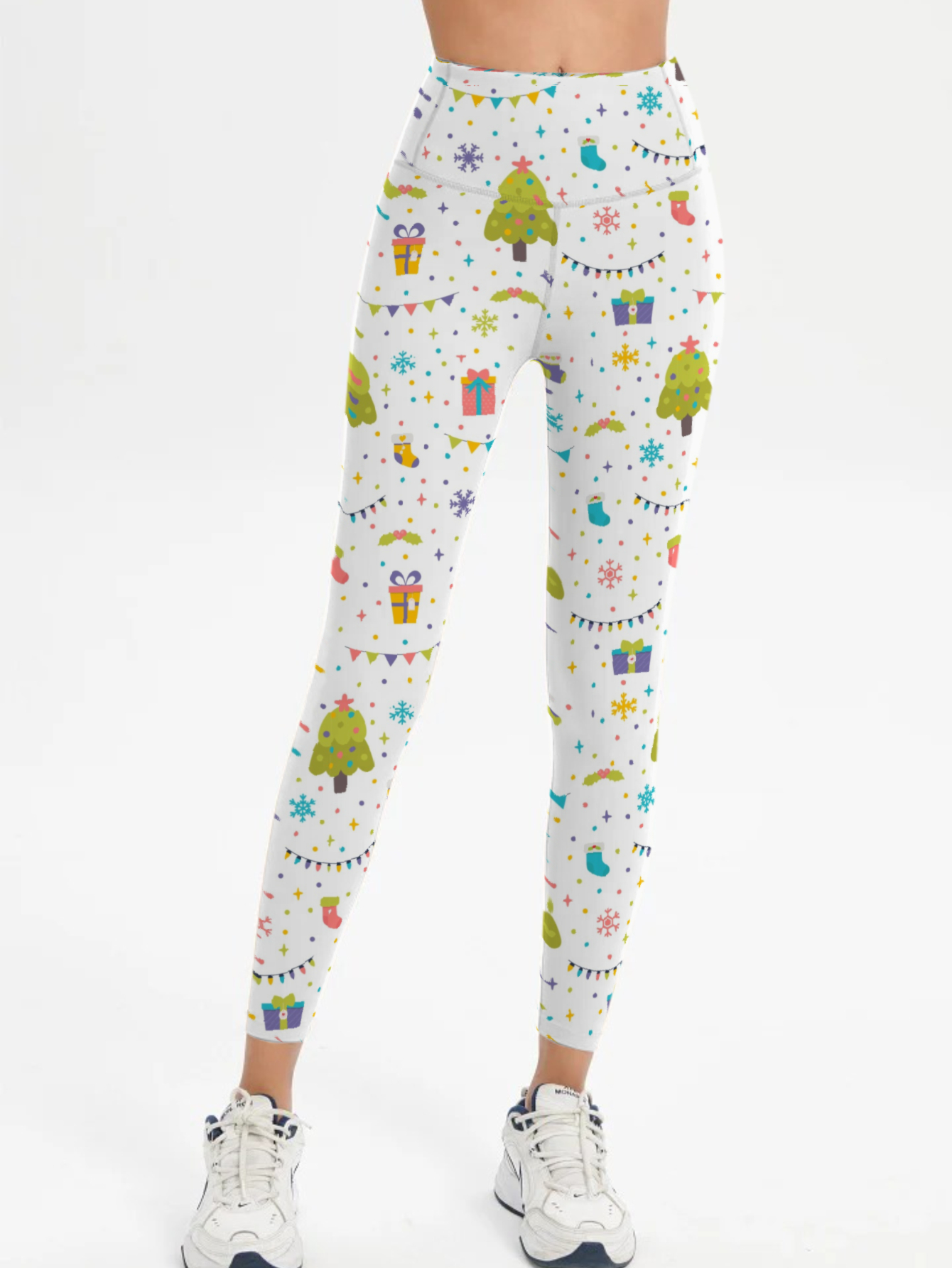 Christmas Element Print Yoga Pants - Mid-Rise Tummy Control, Functional Pockets