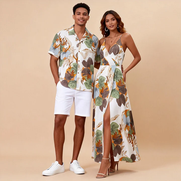 Couples Matching Print Set – Men’s Shirt + Women’s Beach Dress