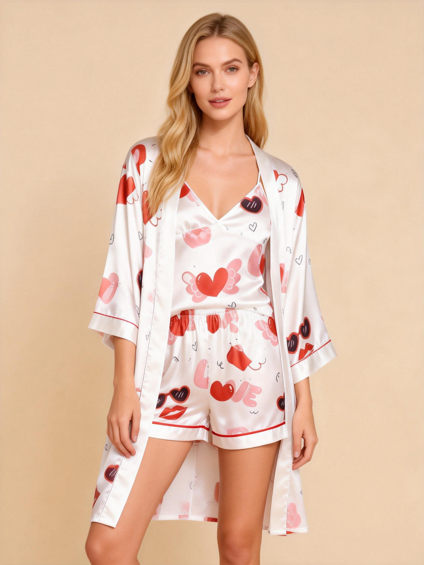 Elegant Satin 3-Piece Loungewear Set with Playful Kiss Pattern