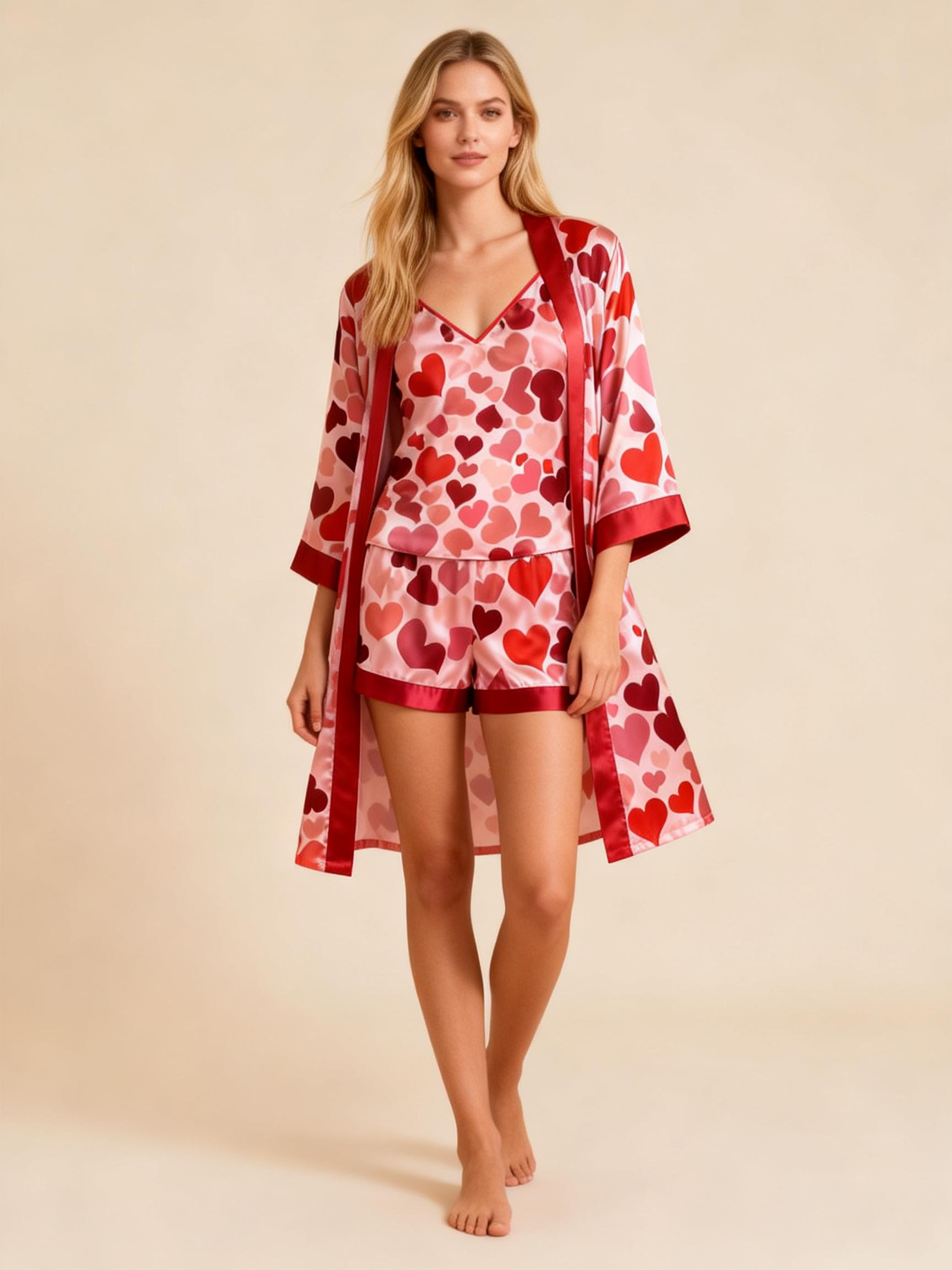Elegant Satin 3-Piece Loungewear Set with Romantic Midnight Design