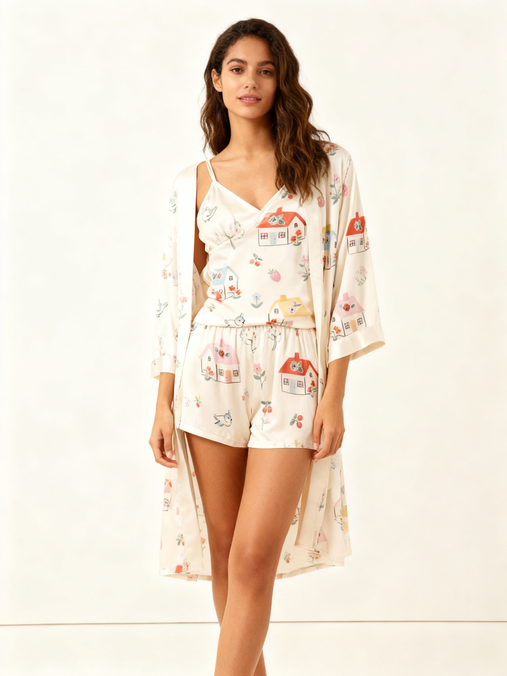 Elegant Satin Loungewear Trio with Lovely House Motifs