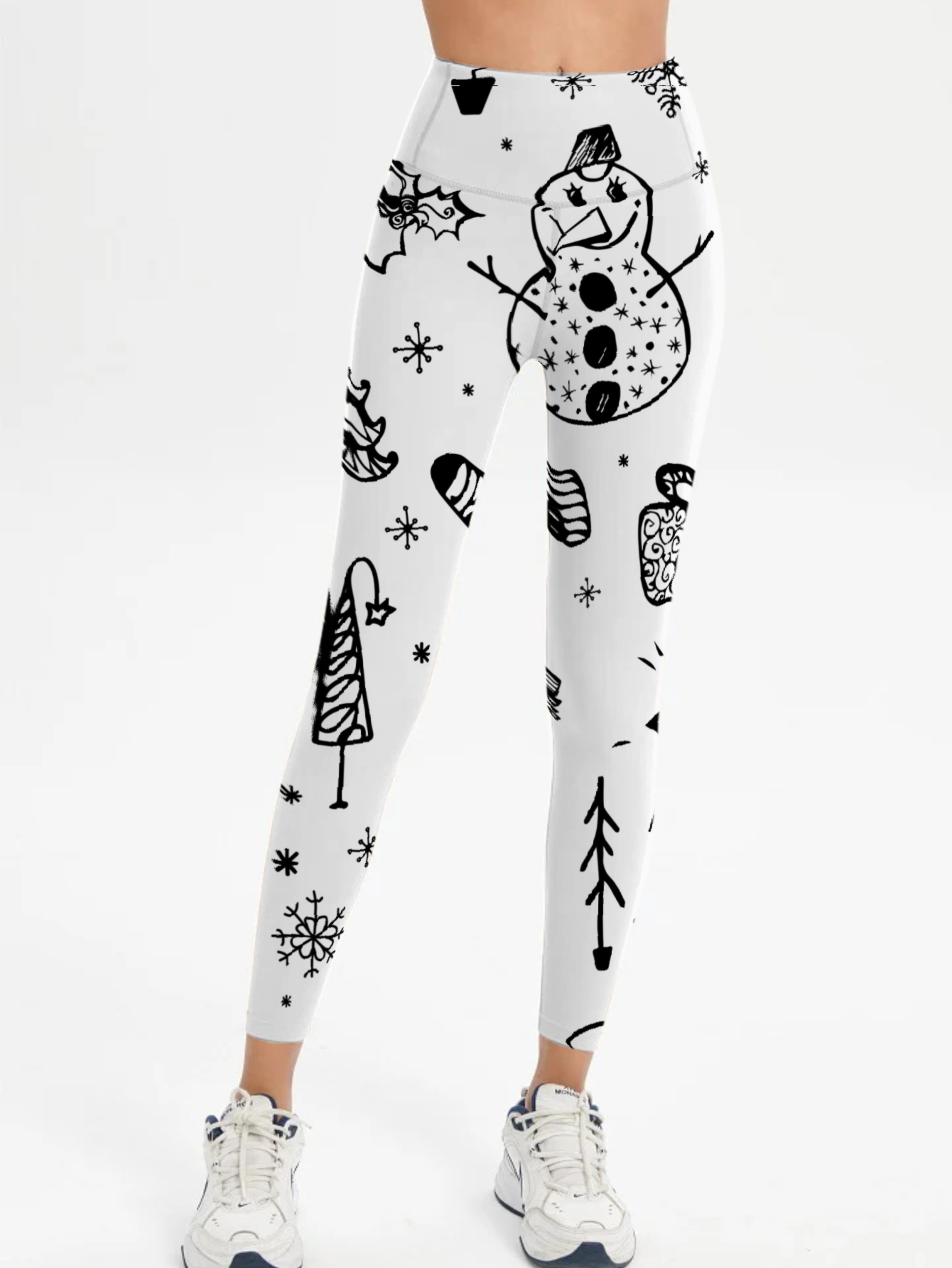 Hand-Sketched Christmas Pattern Print Yoga Pants - Mid-Rise Tummy Control, Functional Pockets