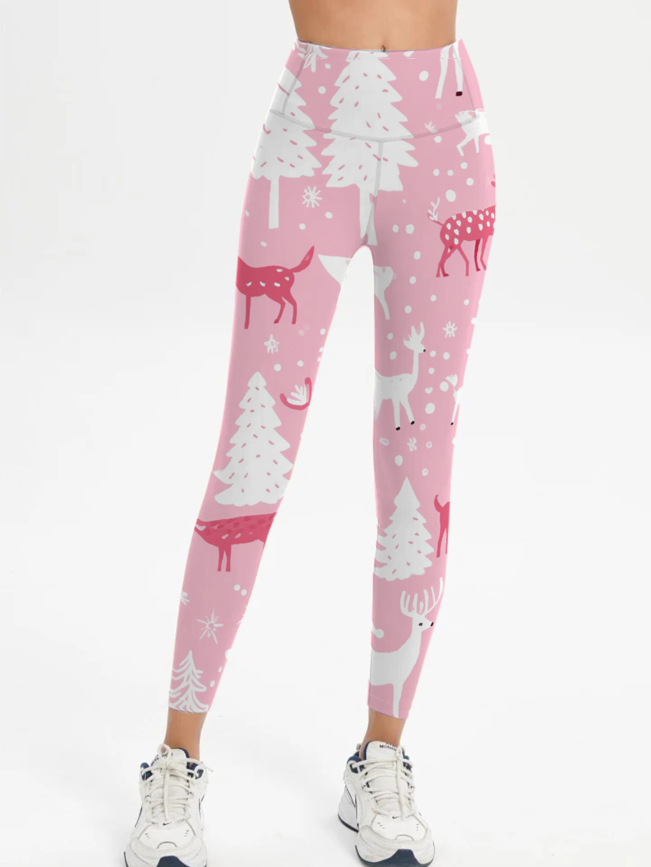Pink & White Christmas Reindeer Pattern Print Women's Leggings - Cozy & Festive & Fashion