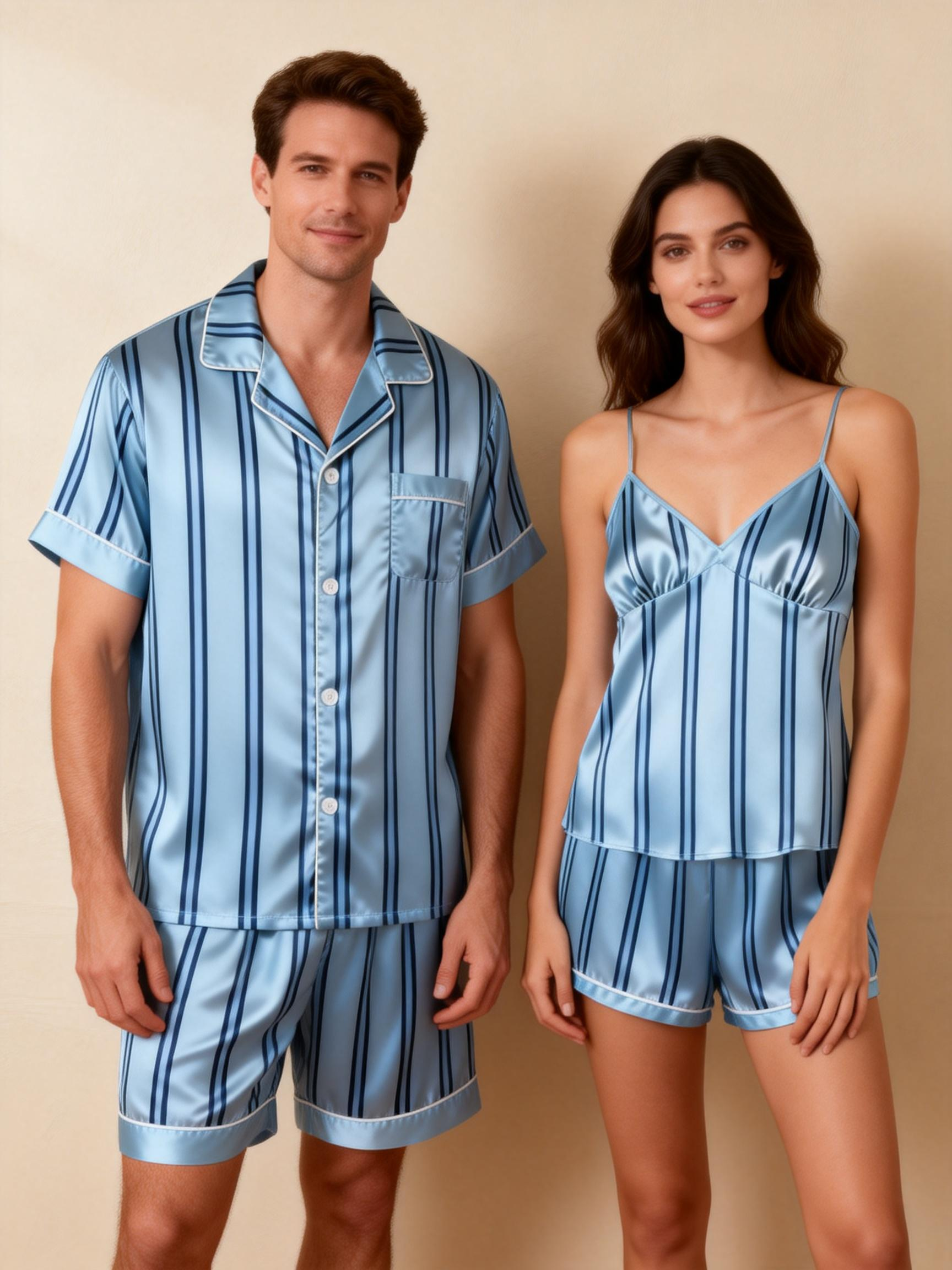 Silky Classic Striped Printed Couple Sleepwear – Satin Short Pajama Set