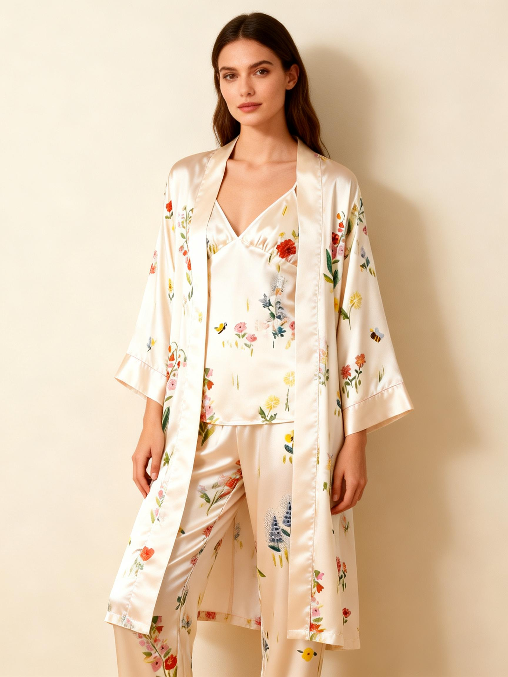 Silky Satin 3-Piece Nightwear Set with Colorful Florals Design