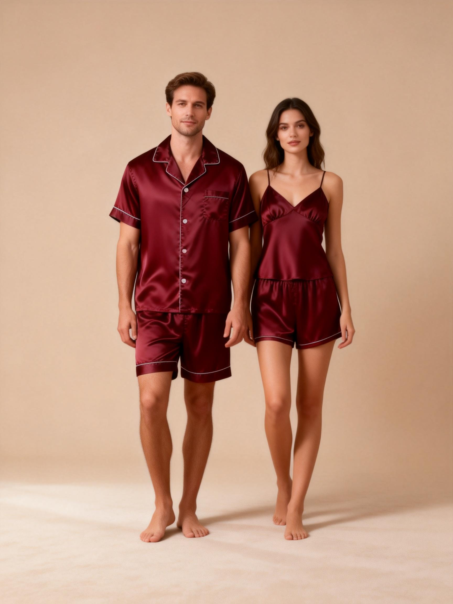 Silky Satin Solid Sleep Set for Couples-Burgundy