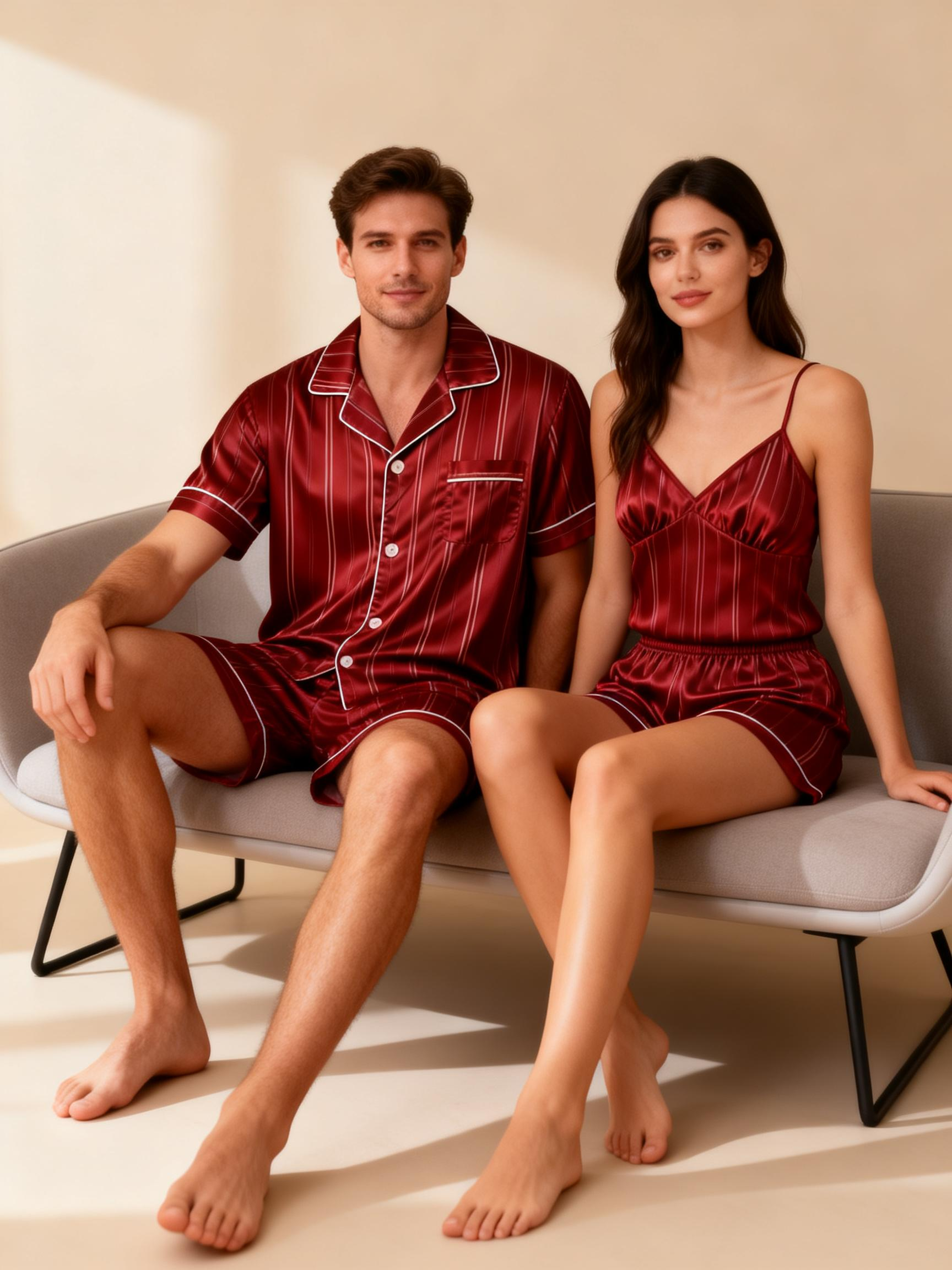 Silky Satin Striped Printed Sleep Set for Couples-Red