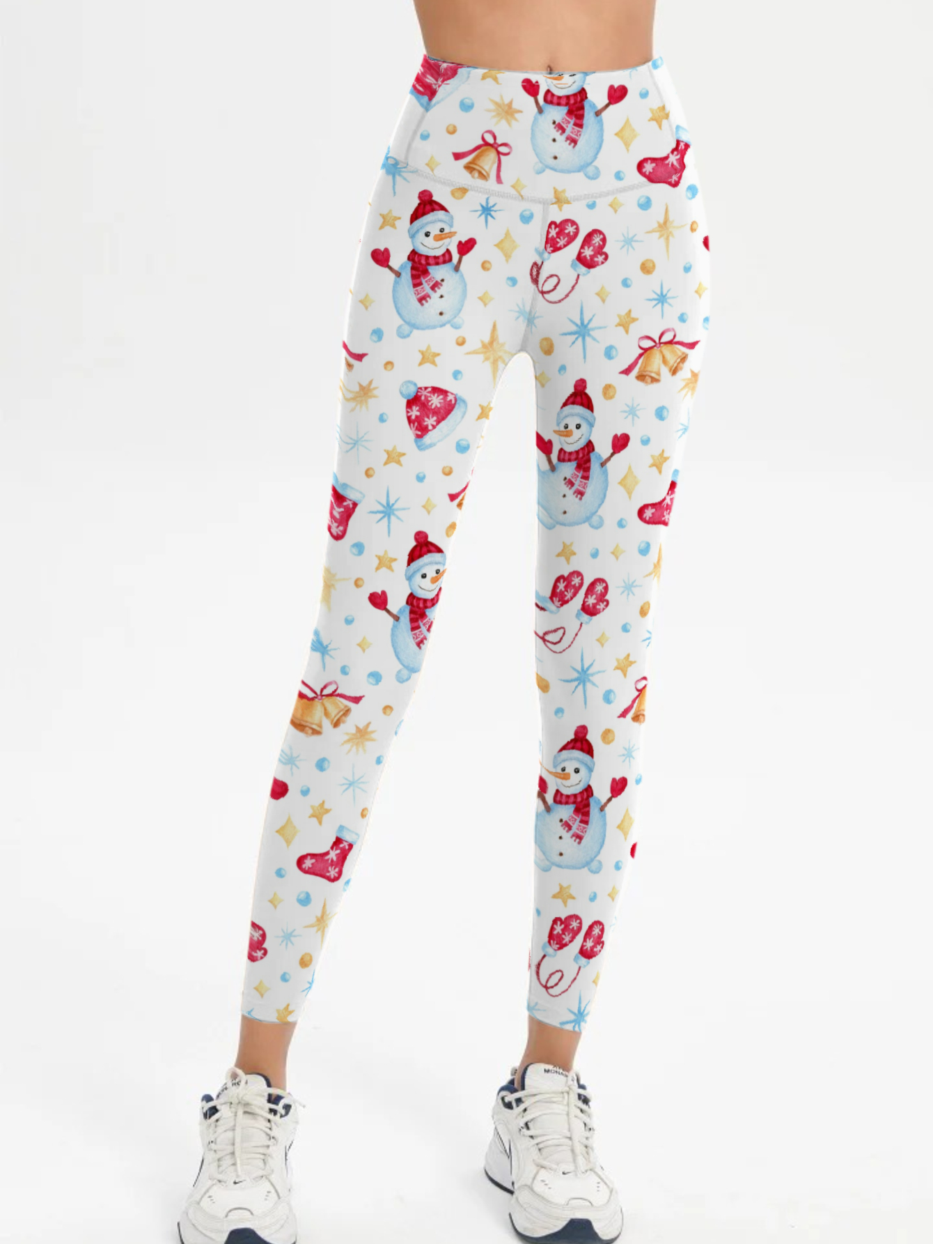 Snowman Cartoon Print Yoga Pants - Mid-Rise Tummy Control, Functional Pockets