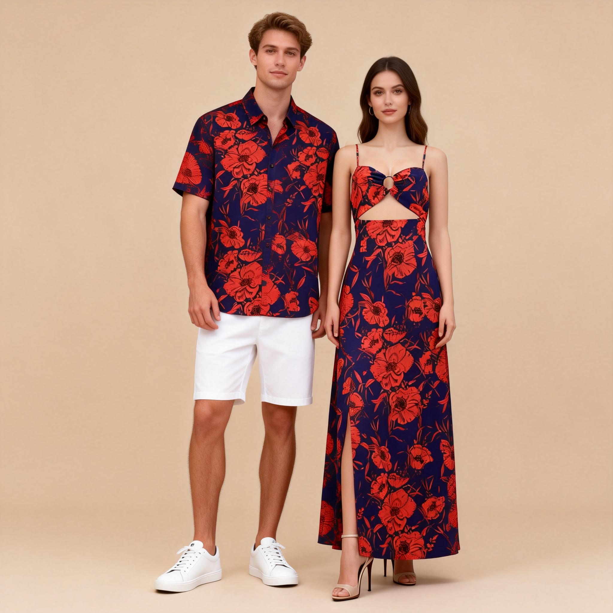 Tropical Matching Set: Men’s Print Shirt & Slit Dress