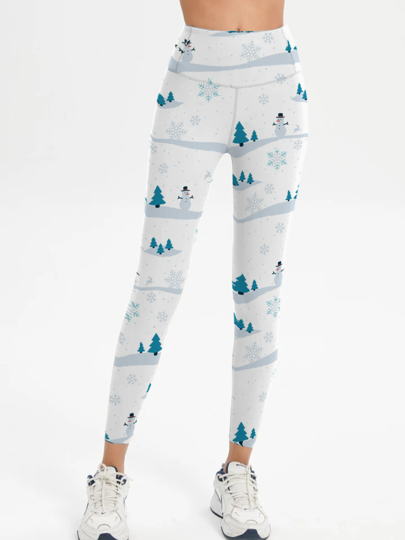 Winter & Snowman Print Yoga Pants - Mid-Rise Tummy Control, Functional Pockets