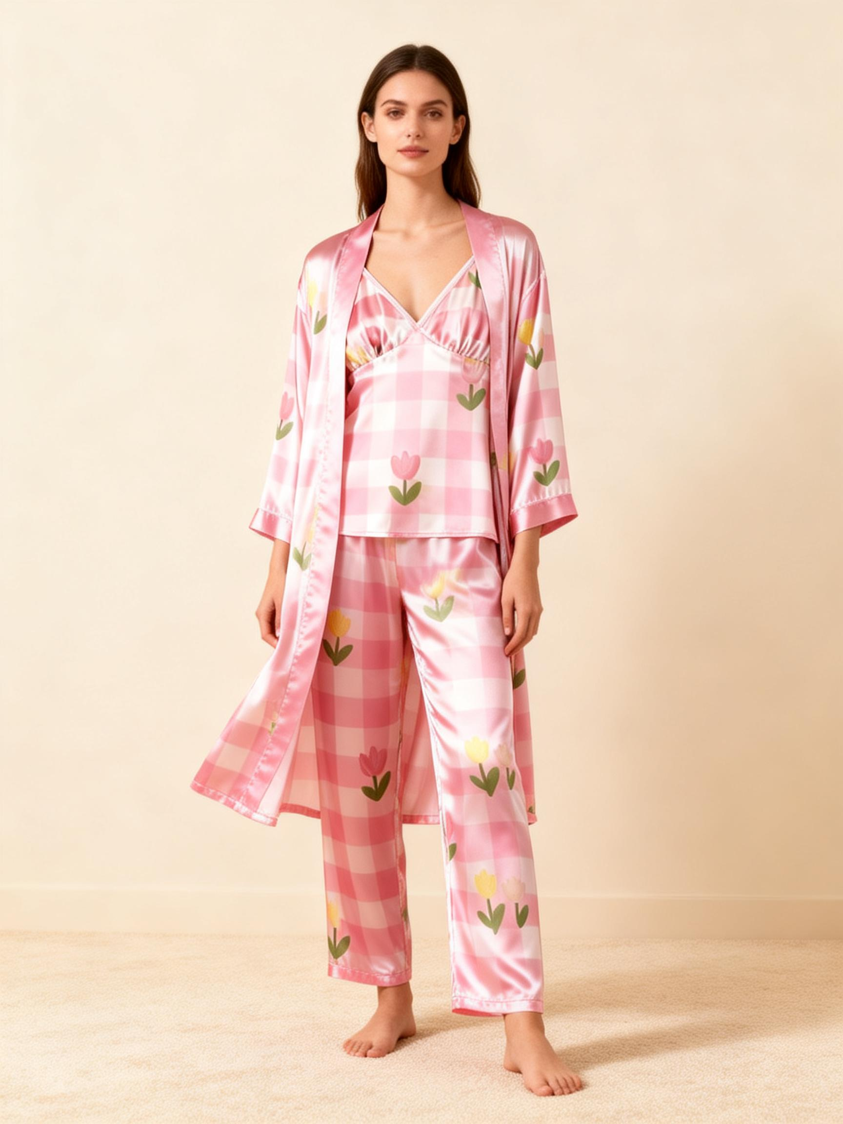 Women’s Classic Pink Plaid Satin Pajama Set with Sweet Florals
