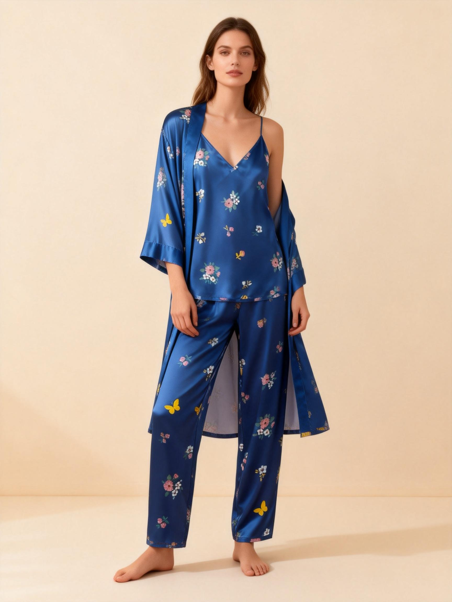 Women’s Navy Silky Satin Homewear Set with Soft Pastel Blossoms Motifs