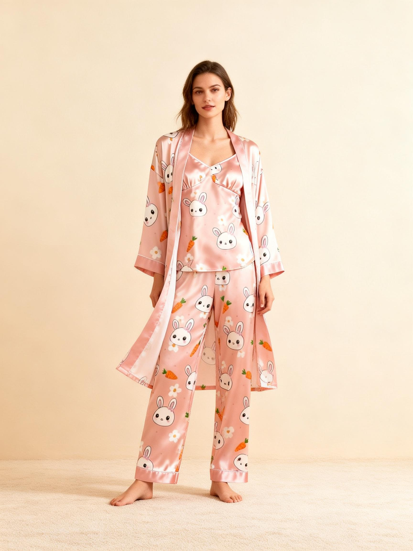 Women’s Satin 3-Piece Loungewear Set in Cute Rabbit & Carrot Style