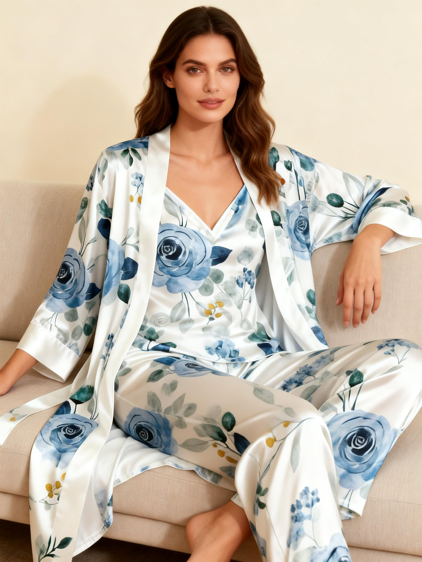 Women's 3-Piece Soft Watercolor Floral Satin Lounge Outfit