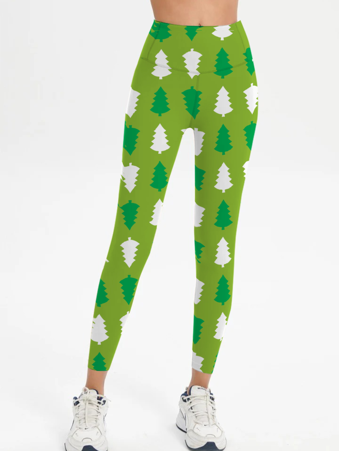 Xmas Tree Print and Grass Green Mid-Rise Yoga Pants for Women